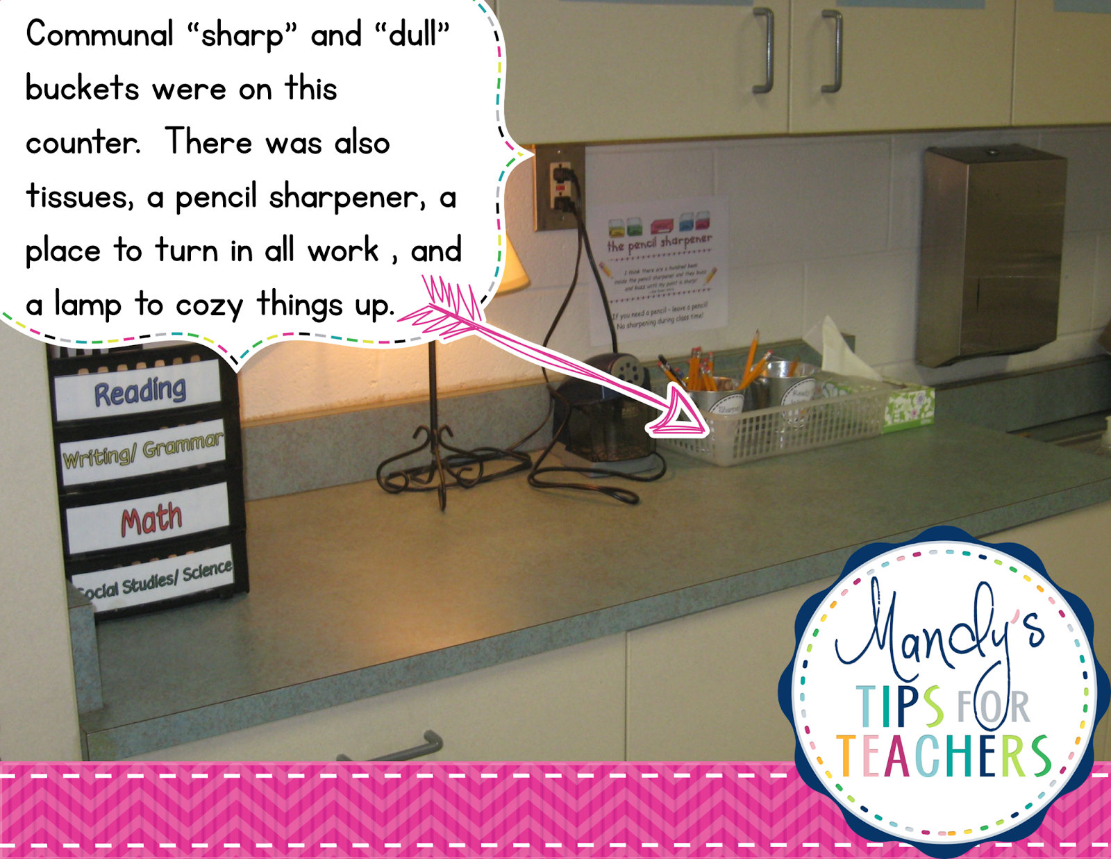 - Pencils ARE a germ fest when shared, so this is a pretty good idea that Karen left, “ I have two bins in the back of the room, one for sharpened pencils and one for dull pencils. Students may trade a dull one for a sharpened one at any time. However, the student must rub the dull one with antibacterial gel (kept next to bins) before putting it in the appropriate container because many of them put pencils in their mouths. I don’t want their germs transferred to my hands when I sharpen them.”
